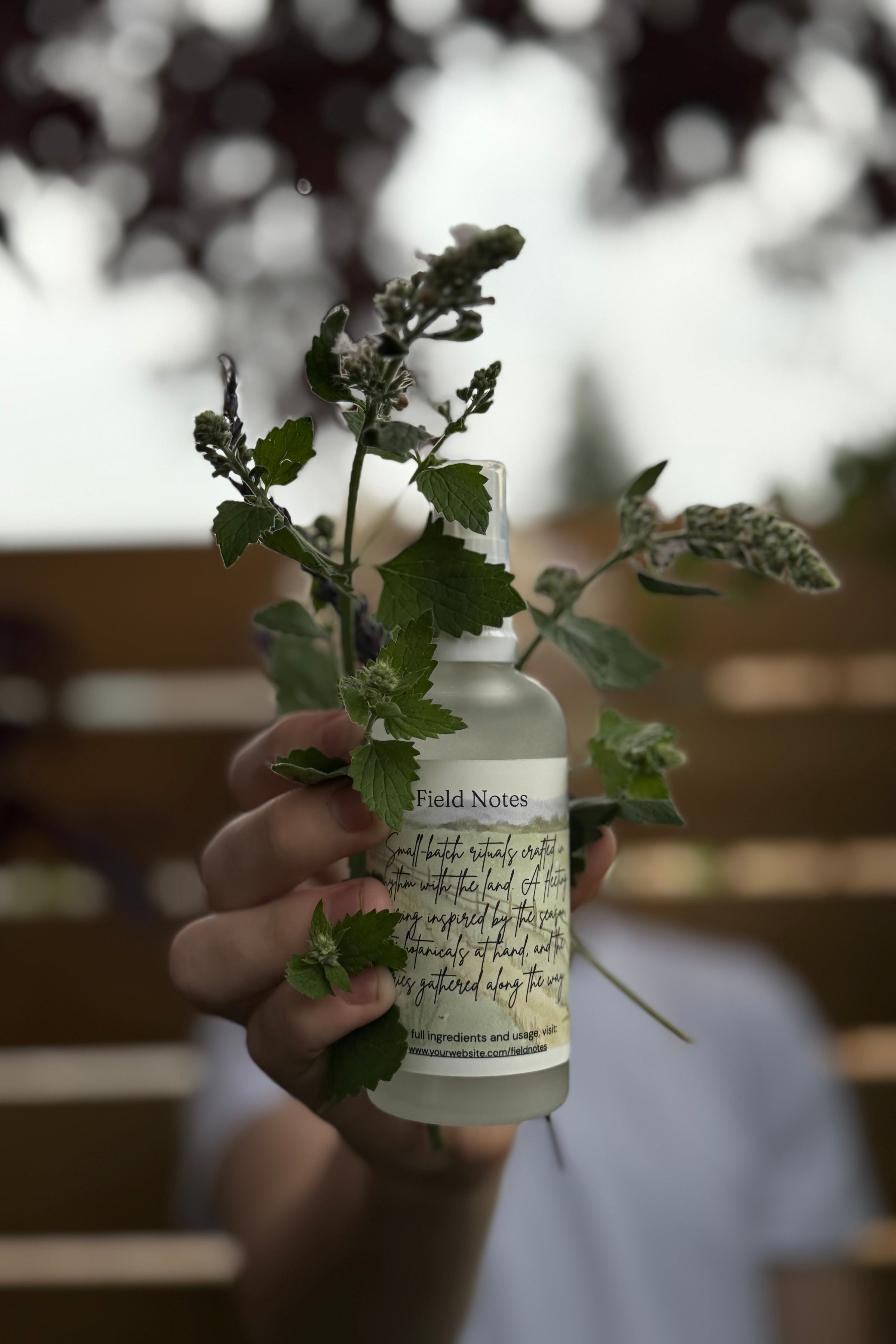 Field Notes: A Seasonal Collection. Micro-batch hydrosol rituals crafted in rhythm with the land. Made in tiny batches—20 to 50 bottles at most—each one rooted in the moment it was made. No essential oils, no alcohols, no fillers. Just the purest expression of the plant and place.