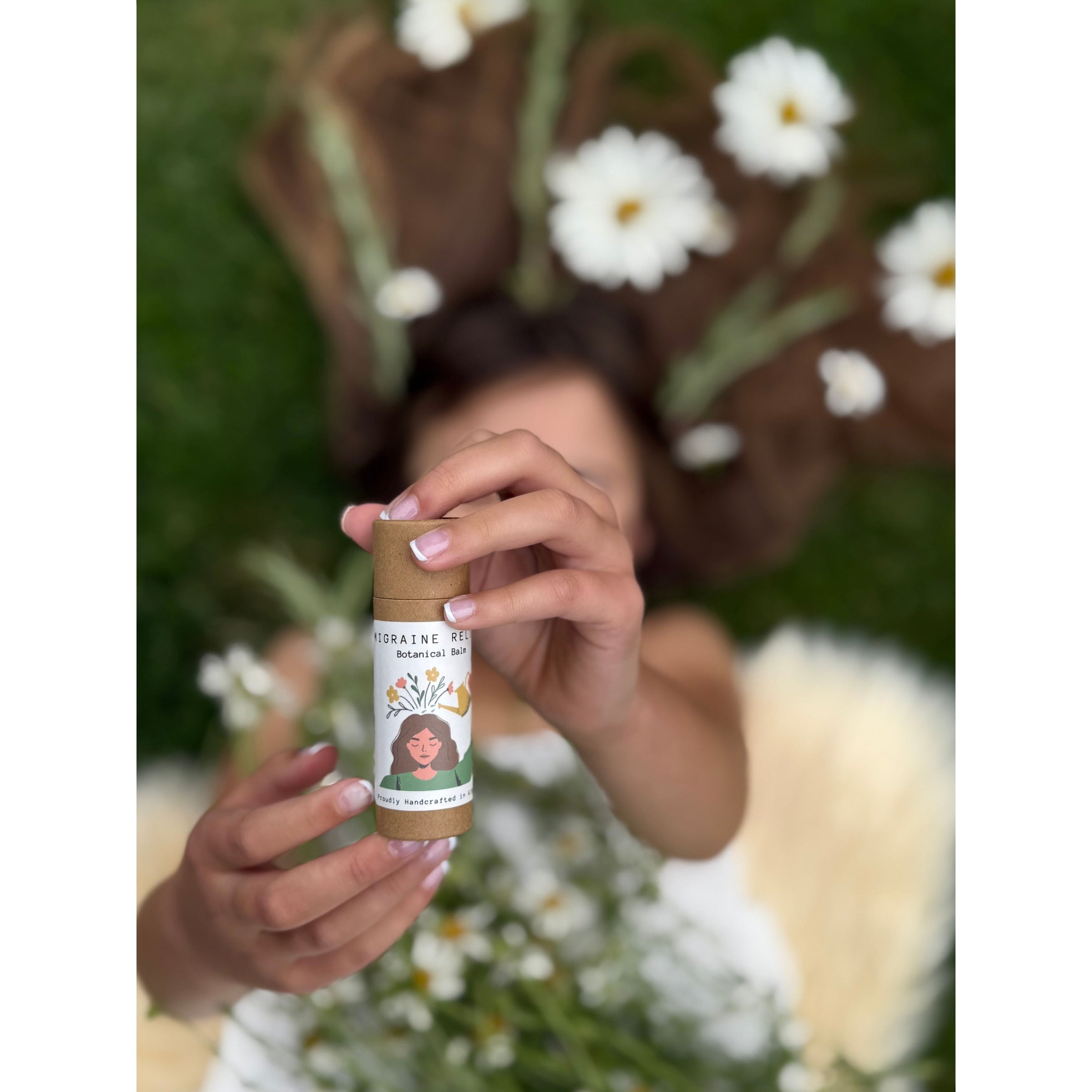 Migraine Relief. 25g Thoughtfully crafted botanical balm in 100% biodegradable and compostable paper push tube - so you can throw the empty package in compost or recycling when you're done and keep our Mother Earth thriving.