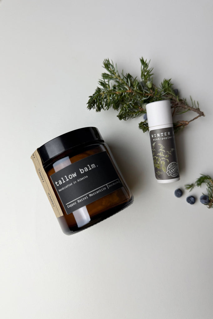 A soothing winter pairing for skin and spirit. This bundle features our Large 4oz Tallow Balm and Winter Mint Tallow Lip Balm — two deeply nourishing essentials crafted to protect and restore during the colder months. Grounding, comforting, and naturally rich in skin-loving ingredients, this duo offers a simple ritual of care to keep you soft, hydrated, and glowing all season long.
