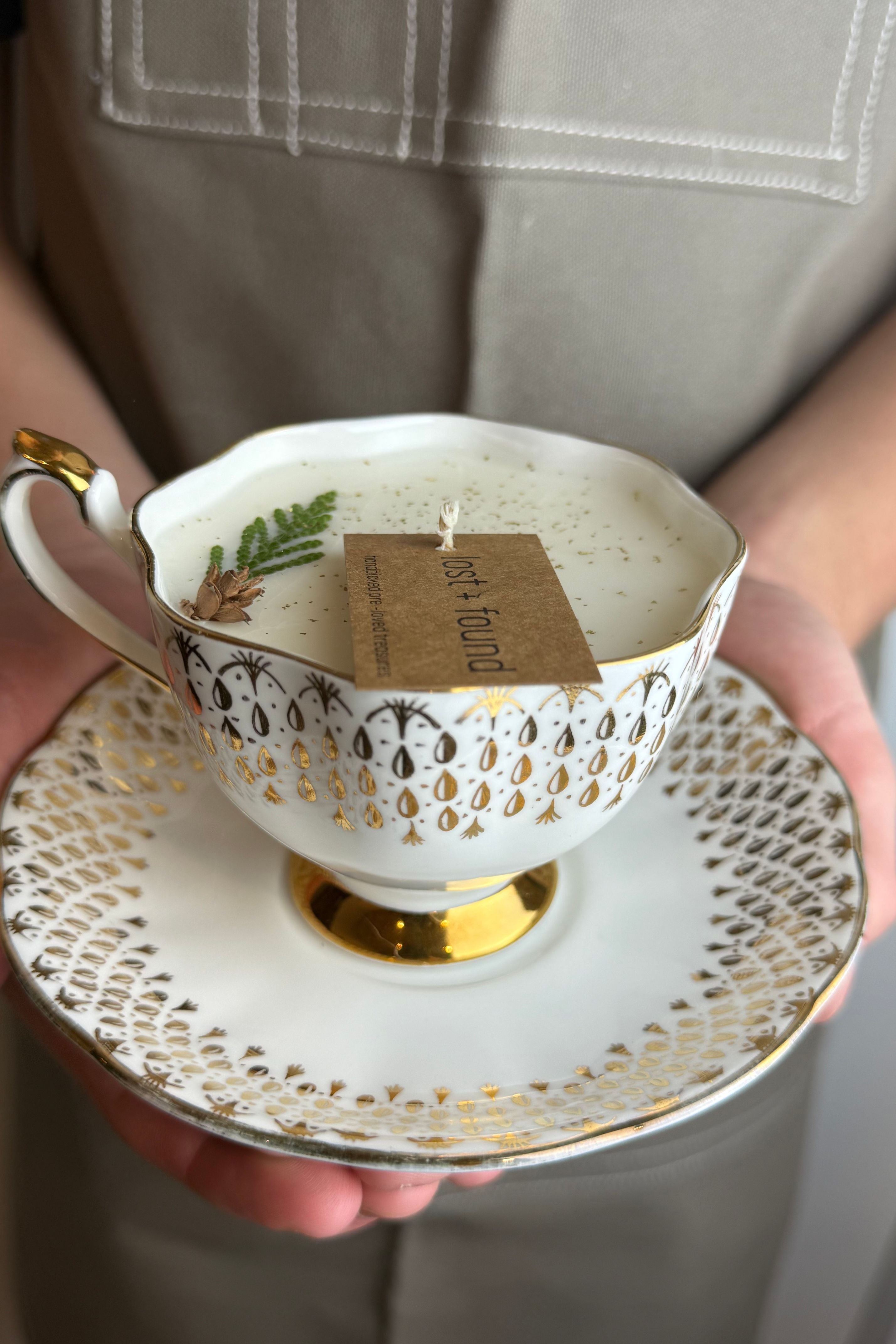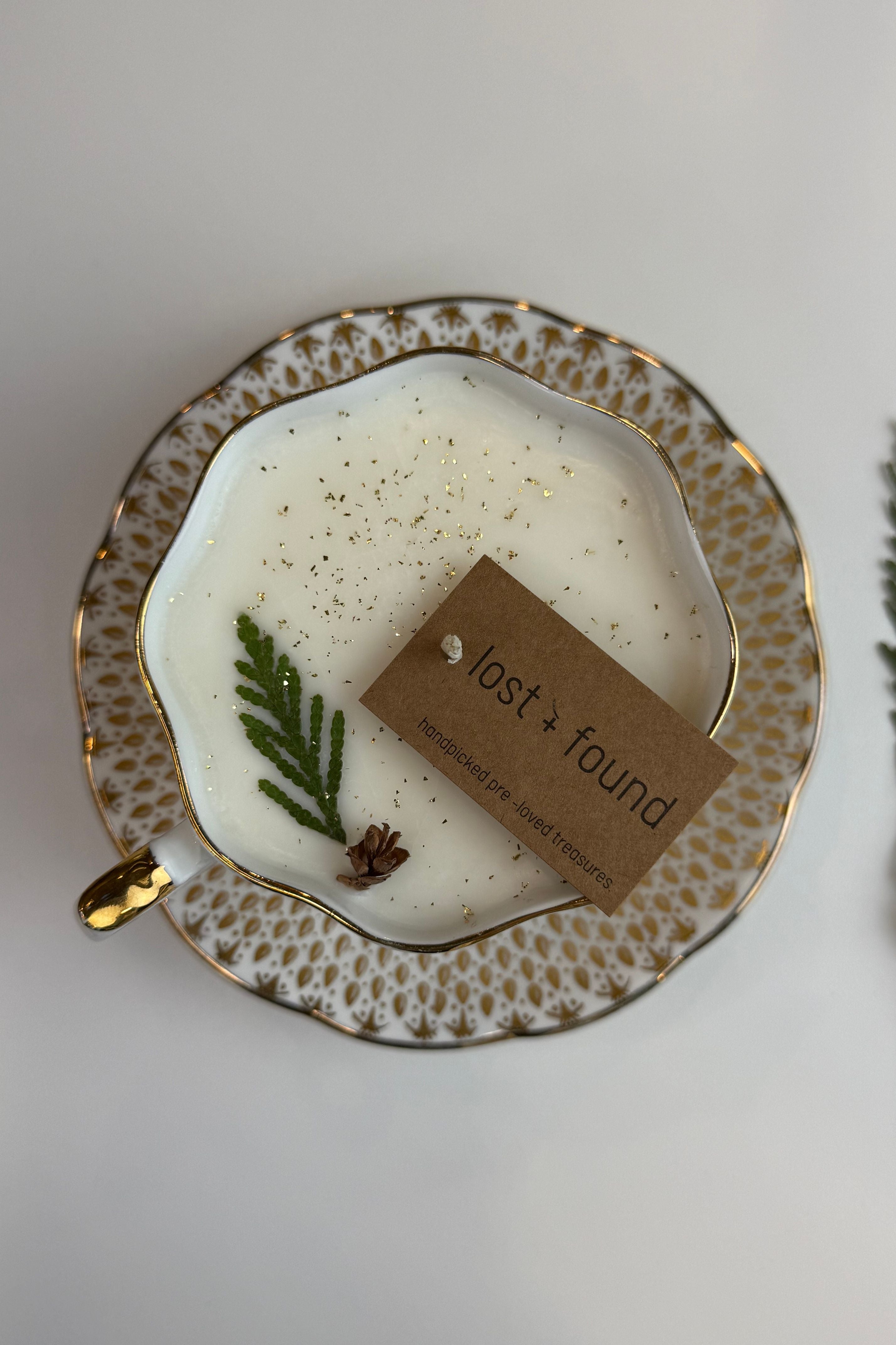 Perfect for gifting. Pre-loved teacup, hand poured with new intention for the year ahead. (soy wax + pure essential oils. Christmas blend of cedar, pine, fir and spruce)