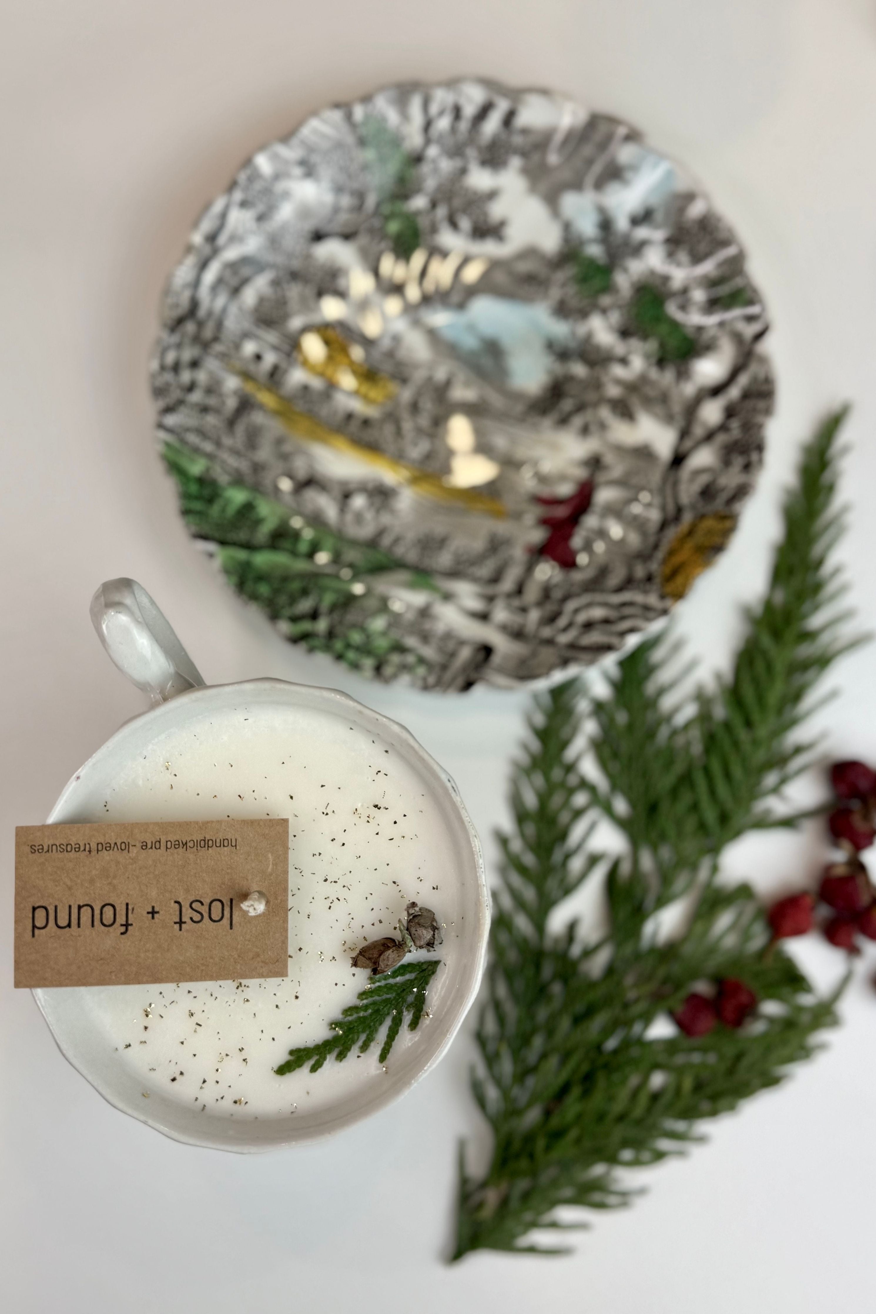 Perfect for gifting. Pre-loved teacup, hand poured with new intention for the year ahead. (soy wax + pure essential oils. Christmas blend of cedar, pine, fir and spruce) Set of 6. Sold Individually