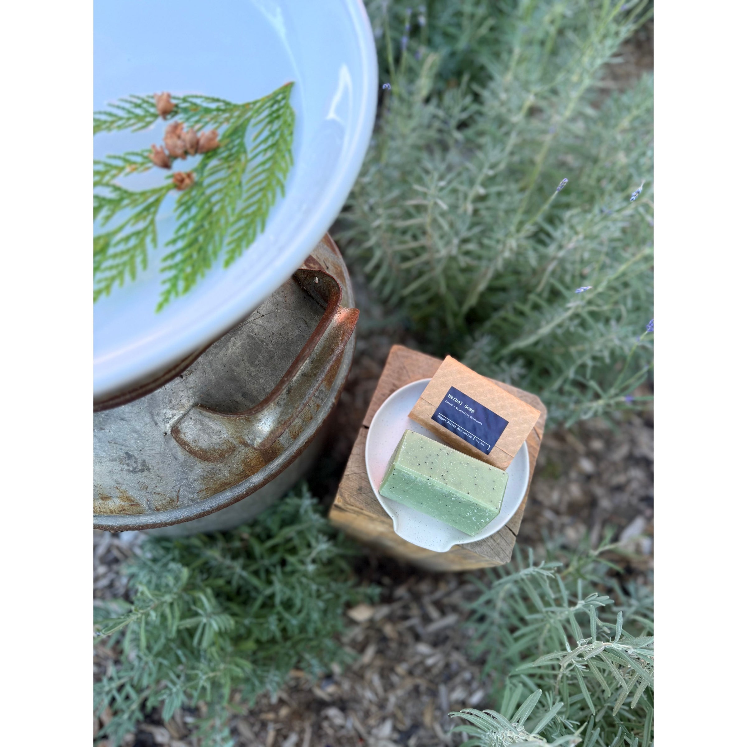 Blended with olive oil, sunflower oil, coconut oil, and shea butter, this block lathers soft and nourishing. French green clay adds a natural earthiness, while a touch of ground pepper speckles the bar with rustic texture. Crafted to bring the forest’s calm into your everyday ritual.