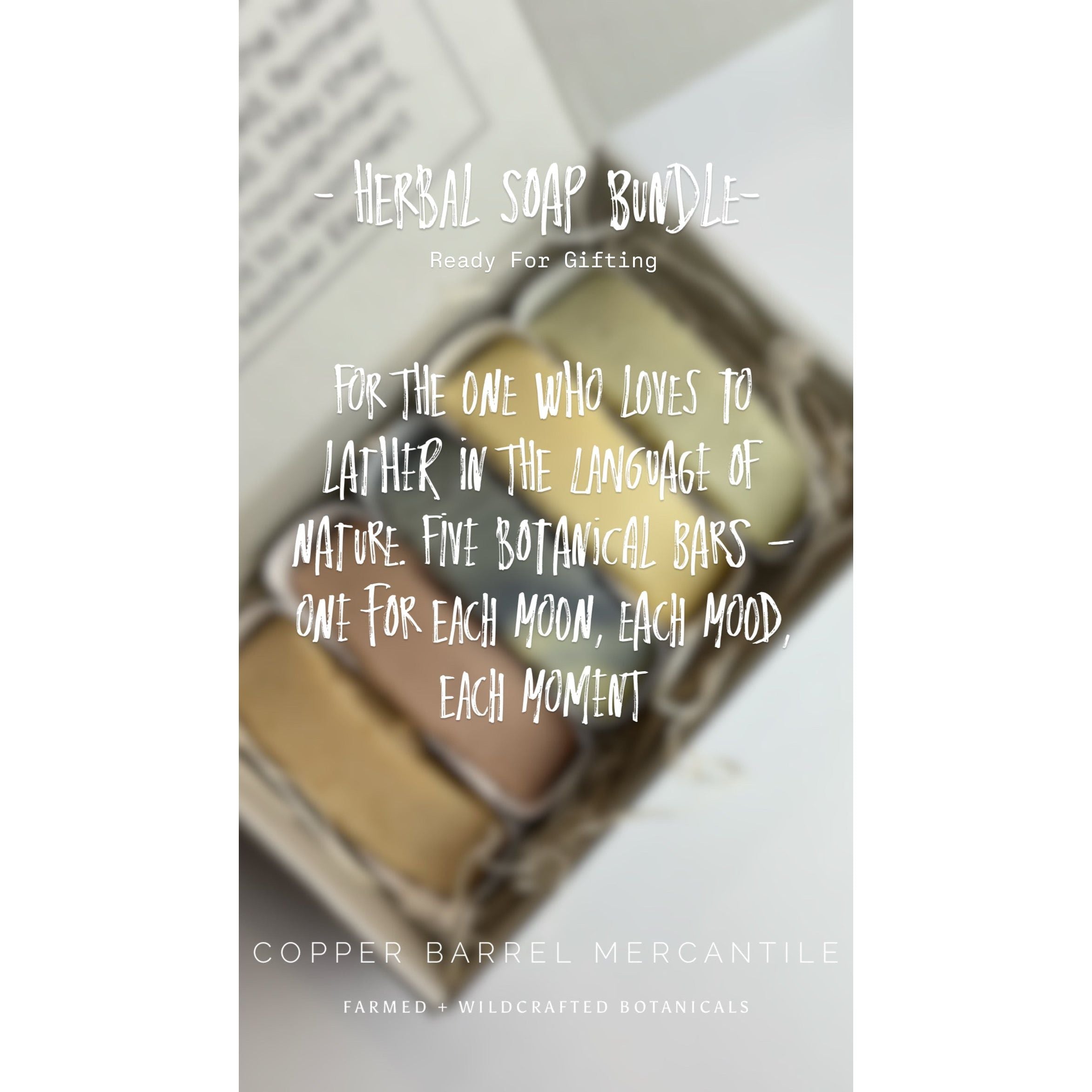 Enjoy the magic of nature and the unexpected with this herbal soap bundle - delightful variety pack of five handpicked full sized soaps. Each bundles offers a unique, "get what you get" surprise, with beautiful blends of botanicals that bring a touch of natures essence to your skincare ritual. Packed in a decorative box ready for gifting.
