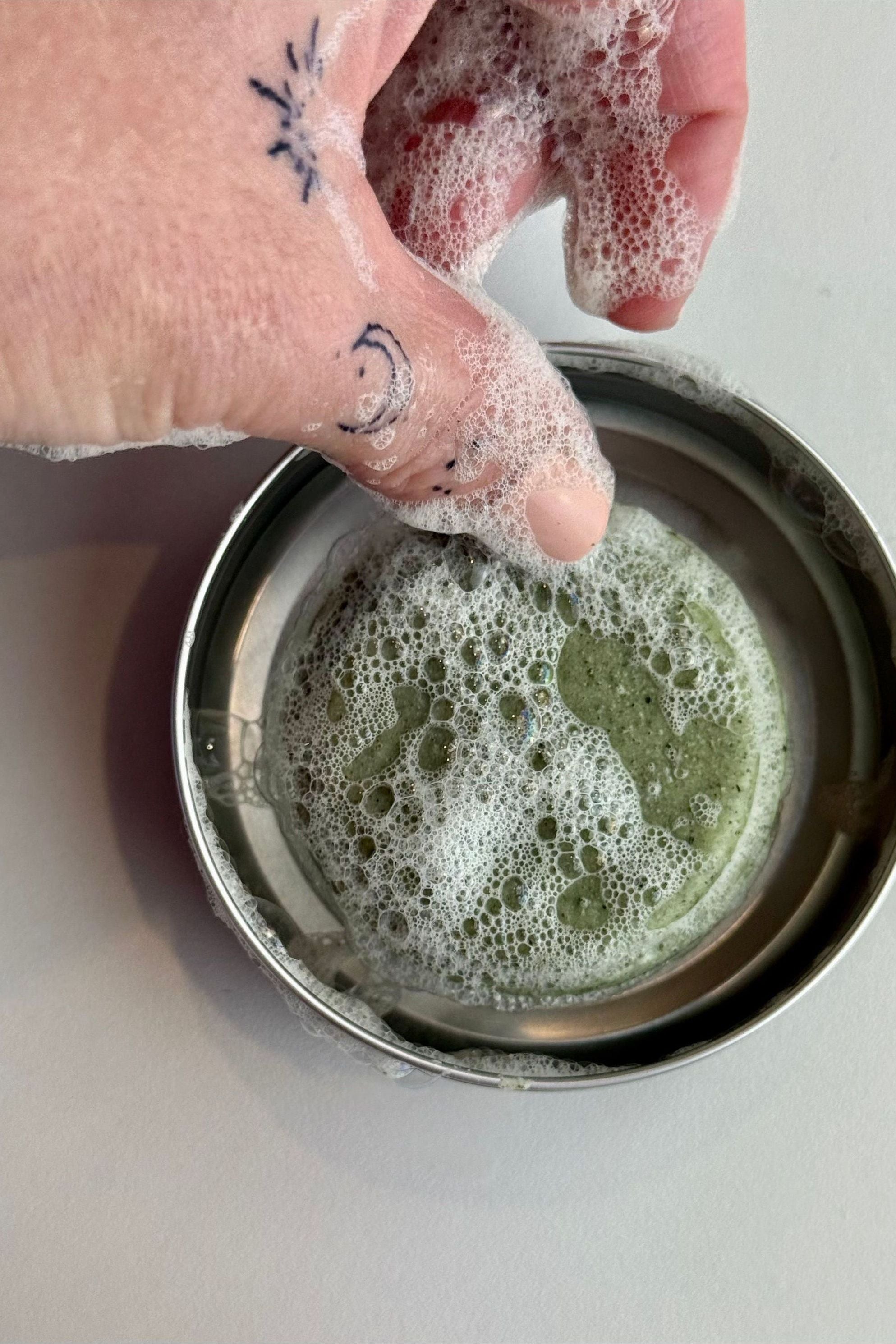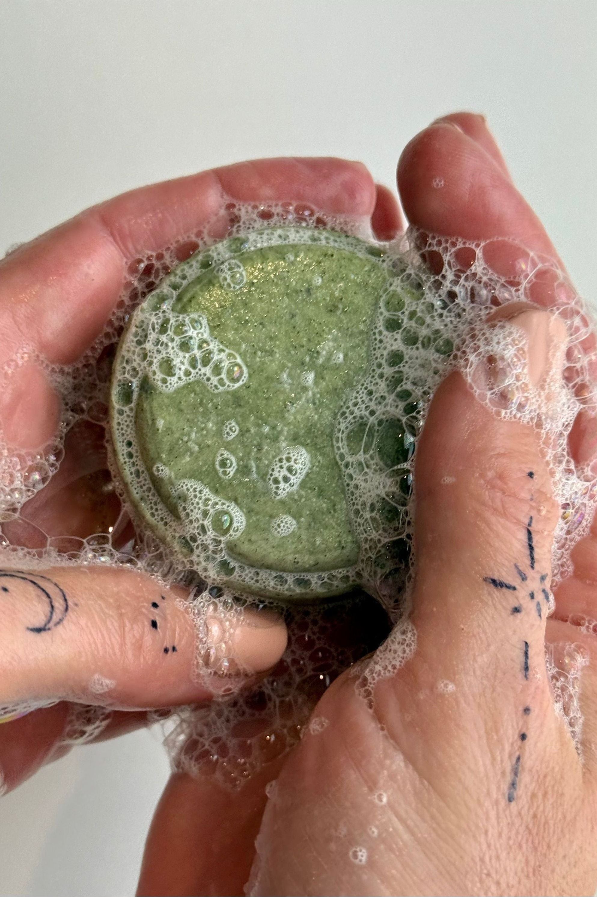 Lather the bar between your hands or directly on your hair. Massage the foam through your scalp and lengths. Inhale deeply, enjoying the fresh herbal aroma. Rinse thoroughly.
